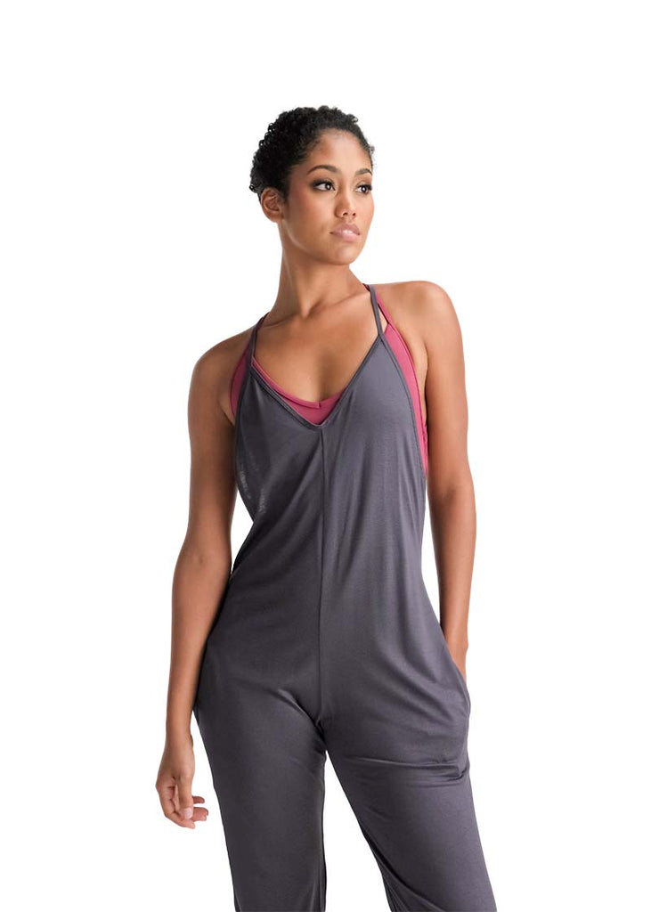 Super soft bamboo camisole romper. Rounded neckline in front, racer back quite indented on the sides. Two side pockets.